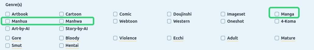Also don't forget the original language field. Both the original language and the manga type tags are often neglected, which makes it harder to filter out only one of them (only mangas, only manhwas, etc)